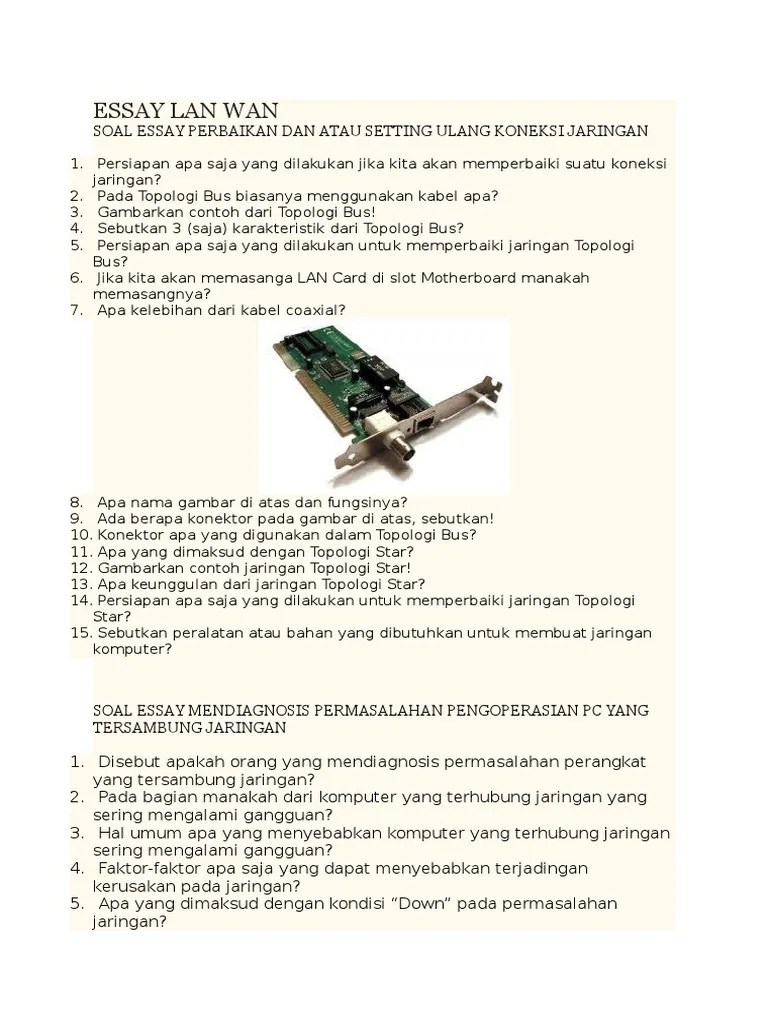 August 24, 2020 kelas 10 , komputer dan jaringan dasar. Pengertian dari 10 base 2, 10 base 5. soal berupa 40 pilihan ganda dan 5 soal uraian atau esai. 10 soal essay sistem operasi beserta jawaban 1.)apa yang dimaksud sistem operasi komputer ? Tetapi setidaknya dengan beberapa contoh soal di atas sudah bisa membantu anda untuk menemukan refrensi yang tepat.